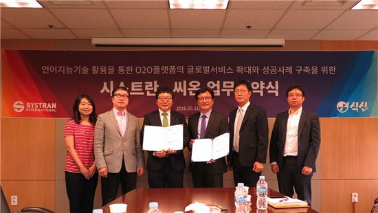 [아시아경제 강희종 기자]다국어 자동 통·번역 및 지능형 언어처리 전문 기업인 시스트란인터내셔널(대표 최창남 www.systrangroup.com)과 위치기반 소셜 서비스 개발사 씨온(대표 안병익)은 시스트란 그룹 본사에서 언어지능 기술 활용을 통한 O2O 플랫폼의 글로벌 서비스 확대와 성공사례 구축을 위해 양사 간 협업지원의 내용을 담은 업무협약을 체결했다고 31일 밝혔다.