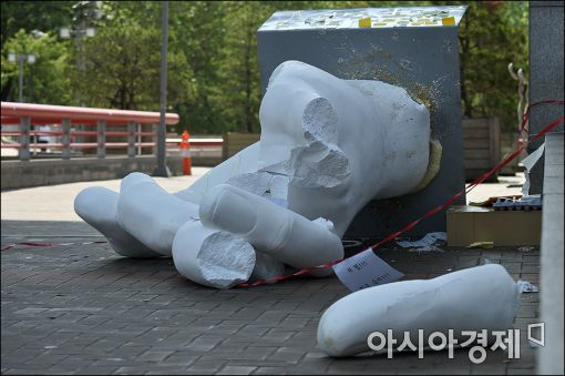 [아시아경제 윤동주 기자] 1일 서울 마포구 홍익대 정문에 세워진 일베 조각상이 누군가에 의해 훼손돼 방치되고 있다.