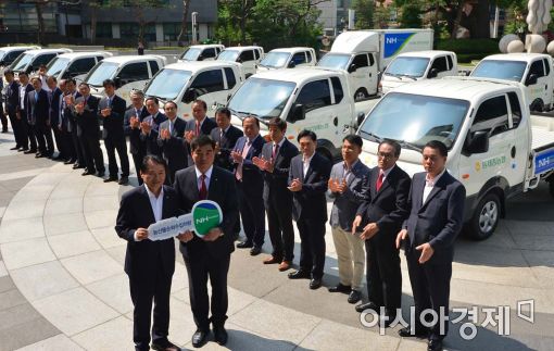 [아시아경제 백소아 기자] 1일 서울 서대문구 농협중앙회 앞에서 열린 농산물 순회수집차량 전달식에서 김병원 농협중앙회장(왼쪽)이 시도별 순회수집 대표 농협 조합장들에게 열쇠모형을 전달하고 있다.
