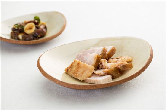 4. 삶은 흑돼지를 먹기 좋은 크기로 썰어 접시에 담고 자리젓무침을 곁들인다.