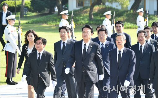 [아시아경제 윤동주 기자] 정진석 새누리당 원내대표와 김희옥 비대위원장 등 비대위원들이 3일 서울 동작구 서울현충원을 찾아 참배하기 위해 현충탑으로 걸어가고 있다.