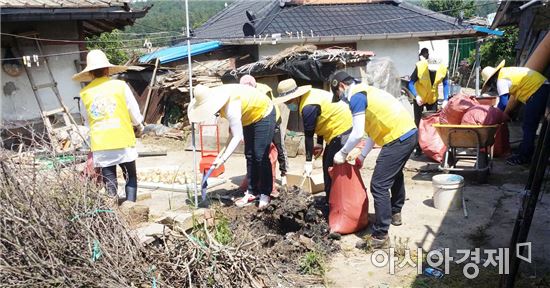 이날 회원들은 낮 한 때 수은주가 30도를 넘는 찜통더위에도 장흥읍 월평리의 한 장애독거노인 가정을 방문하여 쓰레기 수거, 나무 및 잡초제거, 집안청소 등을 도왔다.