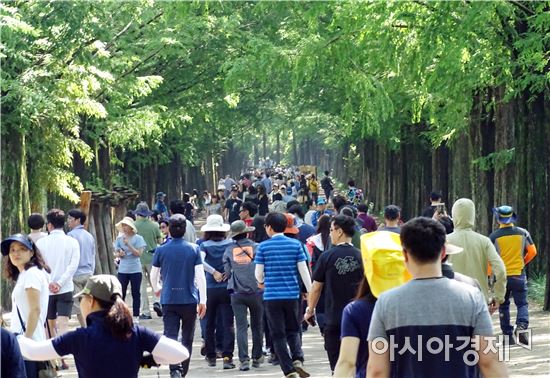 [아시아경제 노해섭 기자]국가산림문화자산으로 지정된 전남 담양의 명물인 ‘메타세콰이아 가로수길’에 휴일인 5일 이른 아침부터 관광객들이 몰려들어 시원한 가로수 길을 걸으면서 힐링을 하고 있다.