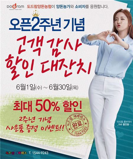 이번 2주년 고객감사 이벤트는 오는 6월 30일까지 계속되며 행사 기간 중 ‘도드람테마파크 스탬프 이벤트’를 통해 일정 금액 이상을 구매한 고객에게는 돈육선물세트 및 수박 등 각종 경품을 증정하는 이벤트도 함께 진행된다.