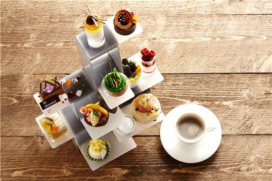 샷 잔에 화이트 초코릿과 함께 데커레이션 된 마운틴 라즈베리와 키위, 하몽과 멜론이 어우러진 건포도 스콘, 발로나 초콜릿 타르트, 부드러우면서도 특유의 씹히는 맛으로 재미있는 식감을 주는 헤이즐넛 크런치와 용과 데커레이션, 블루베리 바닐라 치즈 케이크 외에도 달콤한 리치와 파파야가 첨가된 오이 계란 샌드위치 등의 메뉴가 제공된다. 커피, 티 혹은 패션프룻 카모마일 혹은 베리 베리 티 칵테일 중 선택해 곁들일 수 있으며 주중 오후 2시부터 오후 5시까지 호텔 41층 로비 라운지.바에서 1인 기준 1만7500원(세금 포함)이다.