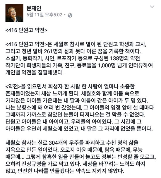 11일 문 전 대표는 자신의 페이스북에 <4.16 단원고 약전>을 읽은 소감을 적었다.