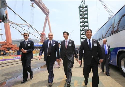 [아시아경제 김혜민 기자] 13일 현대중공업 울산 본사에서 열린 15만9000t급 원유운반선 2척 명명식에서 정기선 그룹선박·해양영업부문 총괄부문장(오른쪽 두번째)과 최길선 회장(오른쪽 첫번째)이 조지 리바노스 선엔터프라이즈사 회장(왼쪽 두번째), 그의 아들인 스타브로스 리바노스(왼쪽 첫 번째)와 야드를 걸어가고 있다.