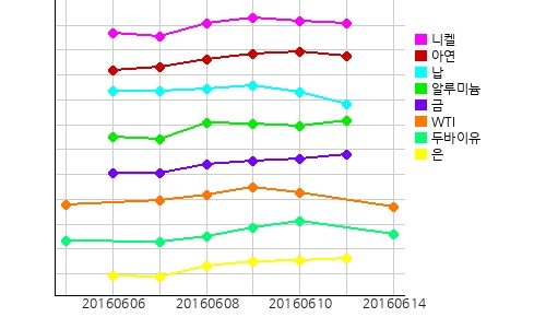 주요광물시세는 알루미늄이 전일 대비 톤당 18.95 달러 올라 1602.85 달러를 기록하는 반면, 주석이 전일 대비 톤당 140 달러 떨어져 17084 달러를 기록했고 니켈, 납, 아연 모두 하향세를 보였다.