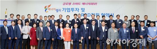 14일 오후 나주 한국전력공사에서 제2차 에너지밸리 기업투자 및 R&D지원 협약식에서 이낙연 전남지사, 윤장현 광주시장, 조환익 한전사장, 임수경 한전KDN 사장이 금원전기솔라텍(주) 등 에너지관련 28개 기업과 투자협약을 한국전기연구원과 에너지밸리기업 R&D지원 협약을 체결한 뒤 기념촬영을 하고 있다. 사진제공=전남도