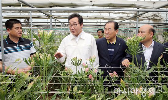 [아시아경제 노해섭 기자]이낙연 전남지사와 정현복 광양시장이 16일 오후 광양시 봉강면 화훼 재배농가를 방문, 박상종 농가로부터 알스트로메리아 재배현황에 대해 설명을 듣고 있다.