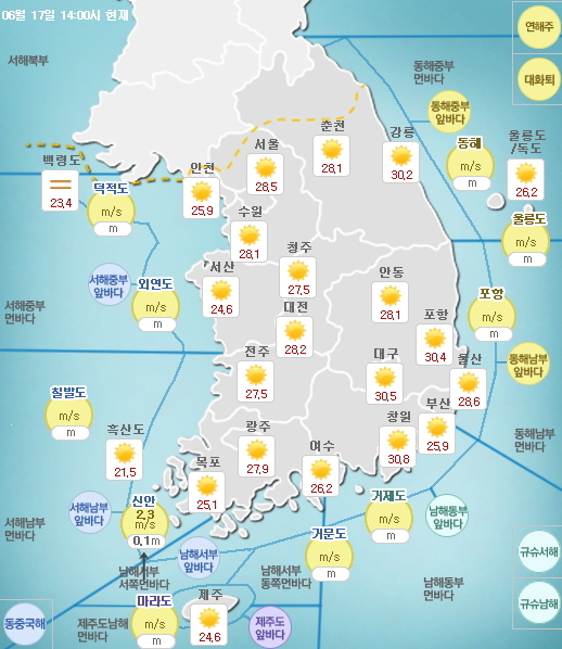 17일 오전 기상청에 따르면 지역별 낮 최고 예상기온은 영천·경산·영덕·경주가 33.0도로 가장 높고 대구 32.0, 김해 32.0도, 속초 31.0도, 양평 31.0도, 대전 30.0도, 세종 30.0도, 서울 29.0도 등을 기록했다.