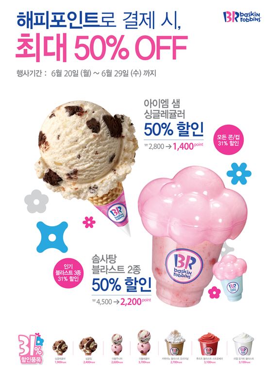 20일부터 29일까지 아이스크림과 블라스트 구입 시, 전액 해피포인트로 결제하면 31% 특별가 혜택 제공