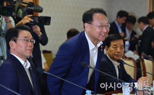 [아시아경제 백소아 기자] 22일 서울 세종로 정부서울청사에서 열린 영남권 신공항 후속조치 관계장관회의에서 유일호 경제부총리(왼쪽 두번째)가 밝게 웃고 있다.