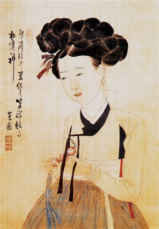 200년 전 미인의 얼굴은 이러했을까? 혜원 신윤복이 그린 '미인도' 속 여인은 그 복식이나 치장을 통해 사대부가의 여인이 아닌 기생임을 유추할 수 있다. 사진 = <미인도>, 신윤복, 비단에 채색, 113.9*45.6㎝ 18세기 말, 간송미술관