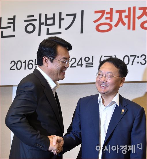 [아시아경제 윤동주 기자] 유일호 경제부총리 겸 기획재정부 장관이 24일 서울 여의도 국회에서 열린 '2016년 하반기 경제정책방향 당정간담회'에 참석, 정진석 새누리당 원내대표와 이동필 농림수산식품부 장관과 인사를 나누고 있다.