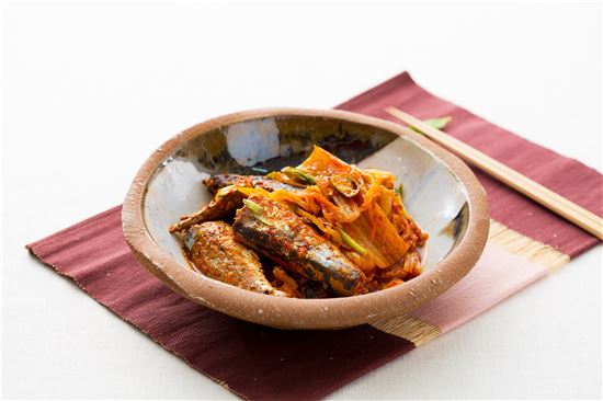 4. 냄비에 꽁치와 묵은지를 넣고 조림장을 넣어 20분 정도 끓이다가 양파, 청양고추, 대파를 넣어 자작하게 끓인다.