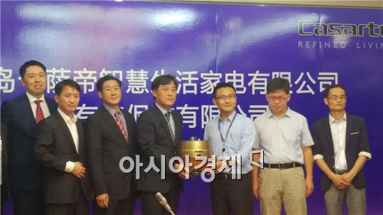 ▲대유위니아는 27일 중국 칭다오 소재 하이얼 공업단지에서 중국 가전업체 하이얼과 중국 시장 내 딤채쿡 판매 협력을 위한 양해각서를(MOU)체결했다. 대유위니아 백성식 전략기획본부장(왼쪽부터 네번 째)과 하이얼 부총재 왕위에(왼쪽에서 다섯번 째).(제공=대유위니아)