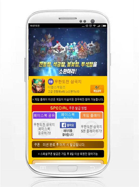 이번에 추가한 스페셜 쿠폰은모바일 디펜스 RPG ‘무한도전 삼국지’로 ‘5분 플레이’, ‘페이스북 페이지 좋아요’, ‘페이스북 공유하기’ 세 가지 미션을 완료하면 고급 경험패 49개, Lv2 팬더 10개 등 약 3만원 상당의 아이템을 증정한다.