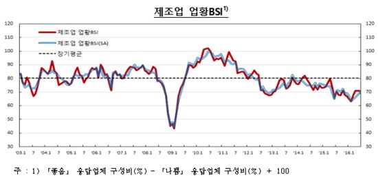다음달 전망은 더욱 부정적이다. 7월 제조업 업황 전망BSI는 72로 전월보다 2포인트 떨어졌다. 하세호 한은 경제통계국 기업통계팀 과장은 "중소기업과 내수업체들을 중심으로 전망BSI가 떨어졌고, 구조조정의 여파 등으로 조선과 화학 등도 전망이 악화됐다"고 설명했다.