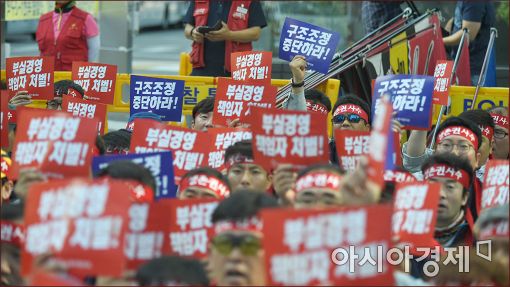 [아시아경제 윤동주 기자] 삼성중공업 노동자들이 29일 서울 서초구 삼성 서초사옥 앞에서 '구조조정 반대' 투쟁을 벌이고 있다.