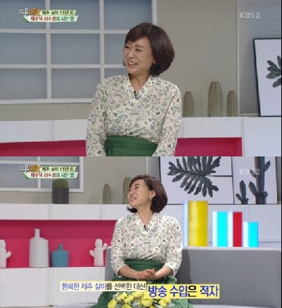 그녀는 ‘여유만만’에 출연해 “제주도에서 서울로 오가는 비행기 값이 7000만원 이상이라던데”라는 질문에 “그건 2년 전이니까 지금은 더 많다”며 “행복한 제주 살림을 선택한 대신 방송 수입은 적자”라고 말했다.