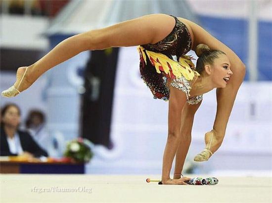 사진 속 알렉산드라 솔다토바는 아름다운 곤봉 연기를 선보이고 있다.