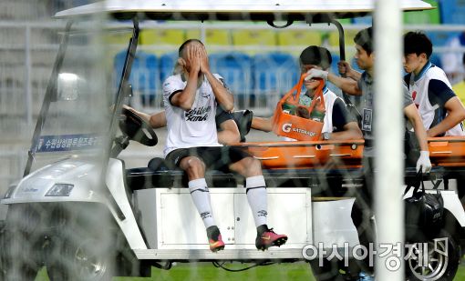 [수원=아시아경제 김현민 기자] 프로축구 수원 삼성과 성남FC의 2016 FA컵 8강전이 13일 수원월드컵경기장에서 열렸다. 성남 티아고가 전반 왼쪽 허벅지를 다쳐 실려 나가고 있다.