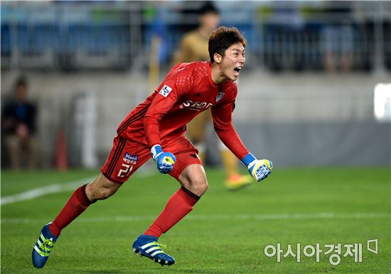 [수원=아시아경제 김현민 기자] 프로축구 수원 삼성과 성남FC의 2016 FA컵 8강전이 13일 수원월드컵경기장에서 열렸다. 수원 양형모 골키퍼가 성남 정선호의 승부차기를 막아내며 4강행을 확정한 뒤 환호하고 있다.