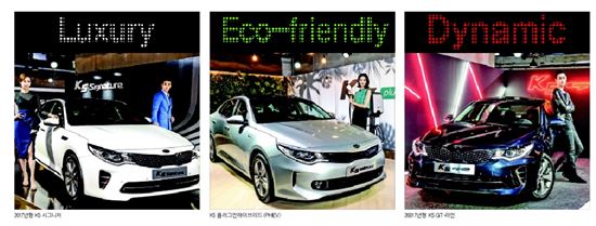 [아시아경제 김대섭 기자] 기아자동차의 중형 세단 'K5'가 지난 12일 새로운 주행성능과 디자인으로 돌아왔다. 2017년형 K5 '시그니처(Signature)'와 'GT-라인' 그리고 'K5 플러그인하이브리드(PHEV)'를 동시에 선보이고 올해 하반기 돌풍을 예고했다.