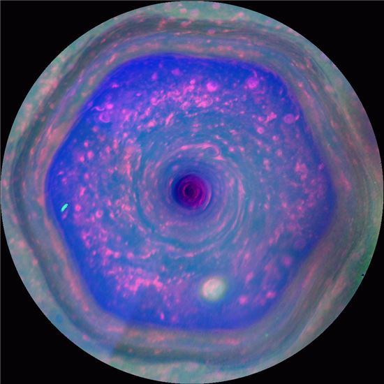 카시니 호의 이미징 카메라를 통해 촬영한 토성의 '6각형 지형'이 컬러 필터를 통해 선보인 것은 이번이 처음이다. 이번 데이터를 통해 과학자들은 '6각형 지형' 안에 있는 구름의 구조와 다양한 변화를 관찰할 수 있다. '6각형 지형' 중앙에는 거대한 허리케인이 있다. 토성의 허리케인 눈(Eye)의 크기는 지구의 그것보다 50배 이상 크다.