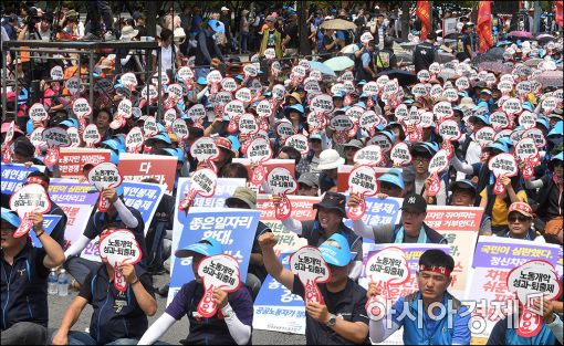 [아시아경제 윤동주 기자] 민주노총 소속 조합원들이 20일 서울 여의도 산업은행 앞에서 성과연봉제, 조선업계 해고 등 현정부의 노동정책을 비난하는 '1차 총파업-총력투쟁 대회'를 갖고 있다.