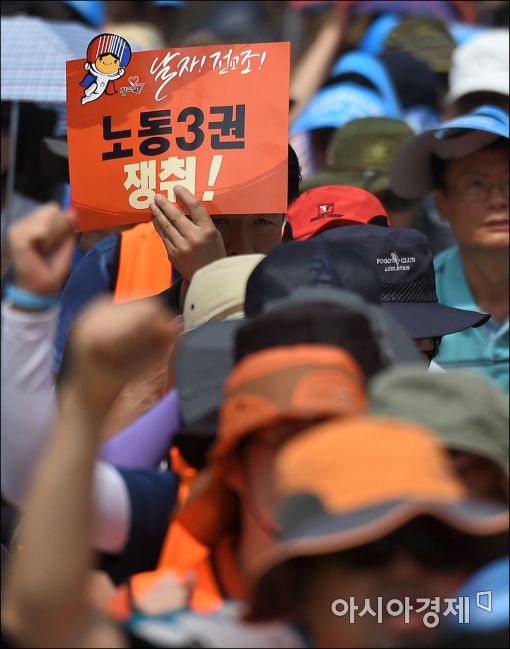 [아시아경제 윤동주 기자] 민주노총 소속 조합원들이 20일 서울 여의도 산업은행 앞에서 성과연봉제, 조선업계 해고 등 현정부의 노동정책을 비난하는 '1차 총파업-총력투쟁 대회'를 갖고 있다.