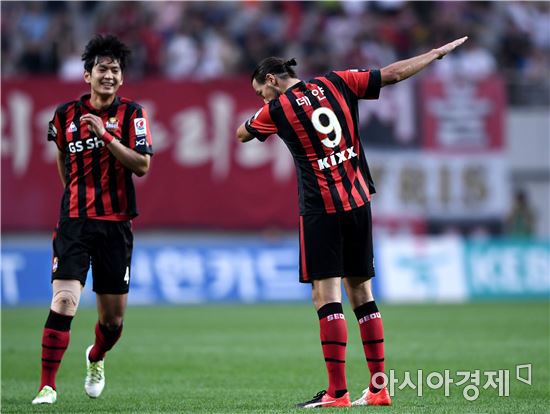 [아시아경제 김현민 기자] 프로축구 FC서울과 전북 현대의 2016 K리그 클래식 경기가 20일 서울월드컵경기장에서 열렸다. 서울 데얀이 1-1 동점골을 넣고 세리머니하고 있다.