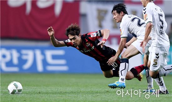 [아시아경제 김현민 기자] 프로축구 FC서울과 전북 현대의 2016 K리그 클래식 경기가 20일 서울월드컵경기장에서 열렸다. 서울 박주영이 전북 최철순의 거친 수비에 넘어지고 있다.