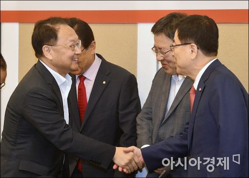 [아시아경제 윤동주 기자] 유일호 경제부총리 겸 기획재정부 장관이 21일 국회에서 열린 세법개정 관련 당정협의에 참석, 김광림 새누리당 정책위의장과 인사를 나누고 있다.