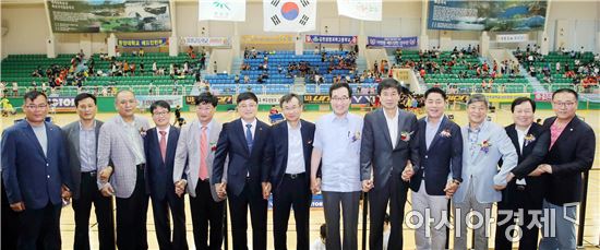 이용대 올림픽(2008베이징올림픽)제패기념 2016 화순 전국학교대항 배드민턴 선수권대회 개막식이 24일 오전 화순 하니움체육관에서 열린 가운데 이낙연 전남지사, 송영언 스포츠동아 사장(오른쪽 두 번째) 등 참석자들이 박수를 치고 있다.