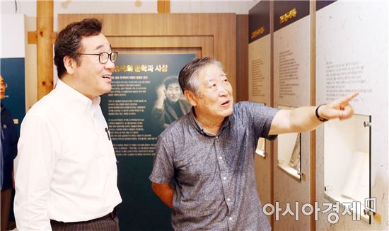 [아시아경제 노해섭 기자]이낙연 전남지사가 26일 오후 순천만 습지 내 순천문학관을 방문, 순천을 대표하는 소설가 김승옥 작가로부터 작품에 대해 설명을 듣고 있다.