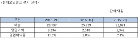 현대오일뱅크는 올 2분기 연결기준 매출 2조8137억원, 영업익 3230억원을 기록했다고 27일 밝혔다. 전분기 대비 각각 11.1%, 60% 증가했으며, 전년 동기 대비 매출은 14.3% 줄었지만 영업이익은 38% 늘었다. 현대오일뱅크는 전년 동기 대비 매출이 줄어든데 대해 "국제유가 하락 영향"이라고 설명했다.