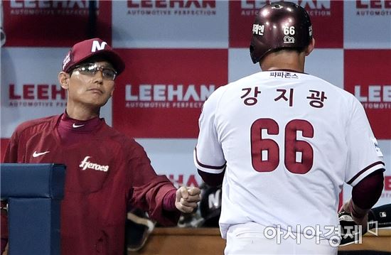 [아시아경제 김현민 기자]프로야구 두산 베어스와 넥센 히어로즈의 2016 KBO리그 경기가 27일 서울 고척스카이돔에서 열렸다. 4회말 무사 1,3루에서 넥센 고종욱의 추가 1타점 적시타 때 득점을 올린 3루 주자 강지광이 염경엽 감독과 하이파이브하고 있다.