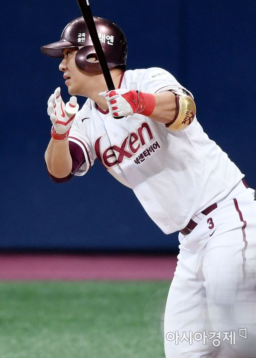[아시아경제 김현민 기자]프로야구 두산 베어스와 넥센 히어로즈의 2016 KBO리그 경기가 27일 서울 고척스카이돔에서 열렸다. 4회말 1사에서 넥센 김민성이 우전 안타를 치고 있다.