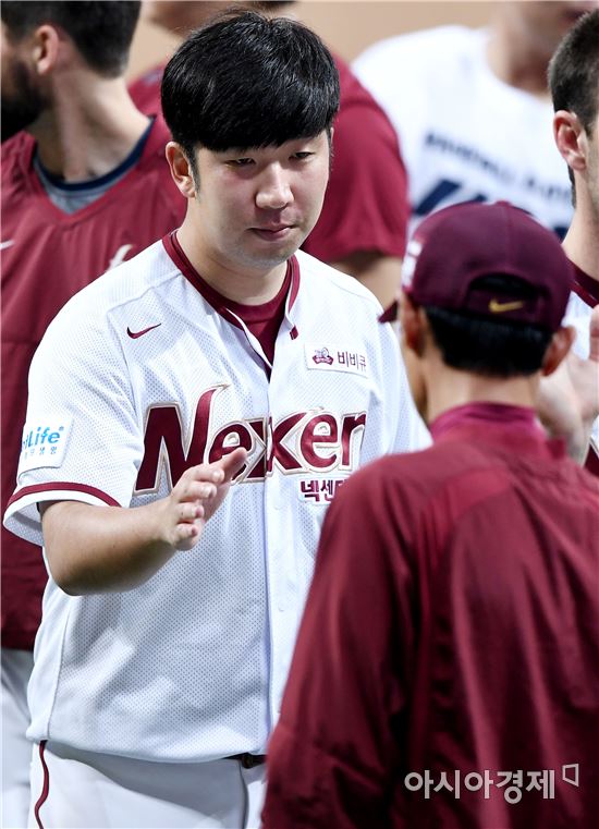 [아시아경제 김현민 기자]프로야구 두산 베어스와 넥센 히어로즈의 2016 KBO리그 경기가 27일 서울 고척스카이돔에서 열렸다. 넥센 신재영이 팀의 9-4 승리를 확정한 뒤 염경엽 감독과 기뻐하고 있다. 신재영은 선발투수로 나서 6이닝 4실점했다.