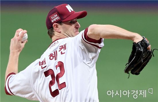 [아시아경제 김현민 기자]프로야구 두산 베어스와 넥센 히어로즈의 2016 KBO리그 경기가 28일 서울 고척스카이돔에서 열렸다. 넥센 선발투수 밴헤켄이 역투하고 있다.