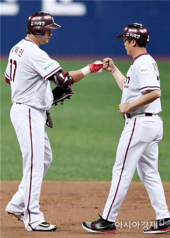 [아시아경제 김현민 기자]프로야구 두산 베어스와 넥센 히어로즈의 2016 KBO리그 경기가 28일 서울 고척스카이돔에서 열렸다. 1회말 2사 1,2루에서 넥센 채태인이 추가 2타점 2루타를 치고 강병식 코치와 하이파이브하고 있다.