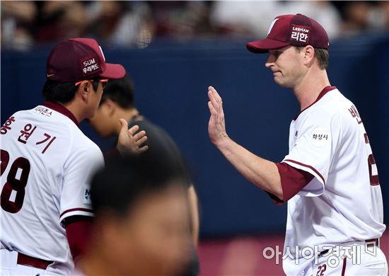 [아시아경제 김현민 기자]프로야구 두산 베어스와 넥센 히어로즈의 2016 KBO리그 경기가 28일 서울 고척스카이돔에서 열렸다. 6회초 넥센 밴헤켄이 6회초 수비를 무실점으로 막고 홍원기 코치와 하이파이브하고 있다. 밴헤켄은 6이닝 1실점으로 국내무대 복귀전을 성공적으로 치렀다.