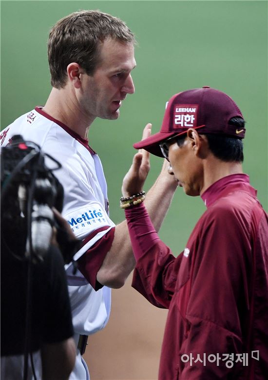 [아시아경제 김현민 기자]프로야구 두산 베어스와 넥센 히어로즈의 2016 KBO리그 경기가 28일 서울 고척스카이돔에서 열렸다. 넥센 밴헤켄이 팀의 12-1 승리를 확정한 뒤 염경엽 감독과 기쁨을 나누고 있다.