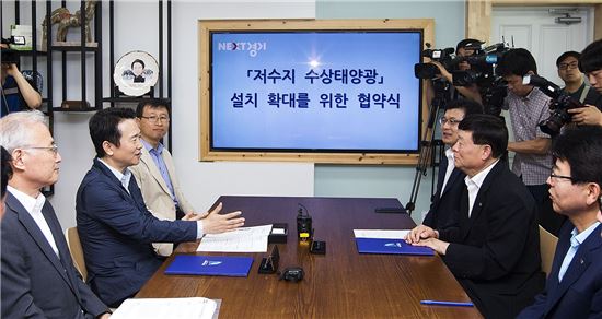 남경필 경기지사와 이상무 한국농어촌공사 사장은 3일 수원 경기도청 도지사 집무실에서 '저수지 수상태양광 설치 확대 업무협약'을 체결했다.