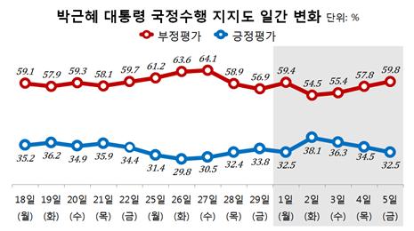 여론조사기관 리얼미터가 8일 공개한 여론조사(레이더P의 의뢰)에 따르면 박 대통령의 국정수행 지지율은 34.6%로 지난주에 비해 3%포인트 상승했다. 부정평가는 지난 조사에 비해 3.1%포인트 떨어진 57.6%로 조사됐다.