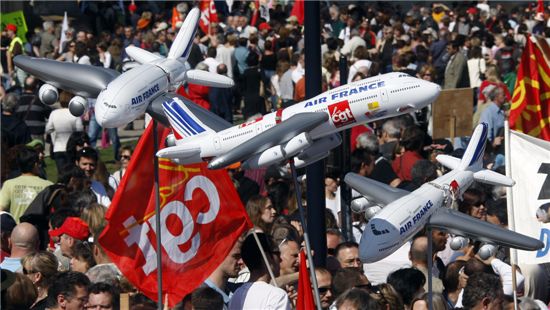 에어프랑스 노조원 수백명은 지난해 10월 5일 사측의 구조조정 계획에 반발, 파리 외곽 본사의 경영진 회의장을 급습했다. 당시 에어프랑스 임원 2명은 성난 노조원들에게 둘러싸여 상의가 찢긴 채 넥타이만 매고 현장을 빠져나갔다.