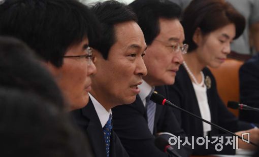 [아시아경제 백소아 기자] 9일 서울 영등포구 국회의사당에서 열린 더불어민주당 원내대책회의에서 우상호 원내대표(왼쪽 두번째)가 발언하고 있다. 이날 우 원내대표는 더민주 초선의원의 사드문제 관련 방중을 비판한 박근혜 대통령에 대해 강도 높은 비난을 퍼부었다.