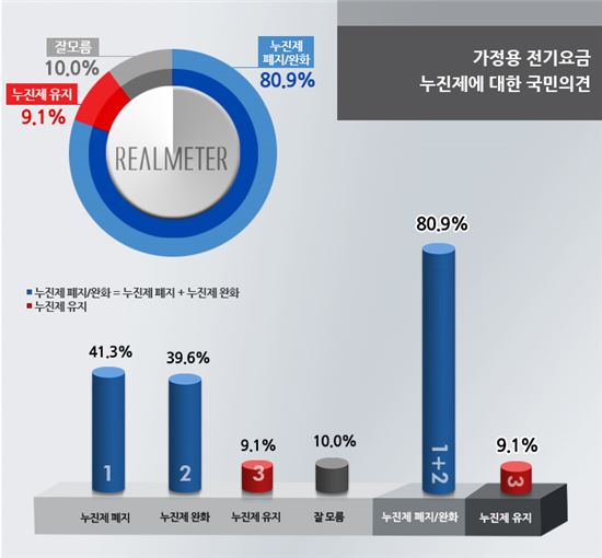 여론조사기관 리얼미터가 11일 공개한 가정용 전기요금 누진제에 대한 여론조사에 따르면 '현행 누진제를 완화하거나 폐지해야 한다(누진제 완화 39.6%, 누진제 폐지 41.3%)'는 의견이 80.9%로, '현행 누진제를 그대로 유지해야 한다'는 의견(9.1%)보다 9배 가까이 높은 것으로 나타났다. 나머지 10%는 잘 모르겠다고 답했다..